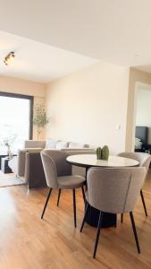 The apartment was modern, clean, and comfortable with a firm bed and good shower, the kitchen and laundry room were well stocked. The location was in the city centre close to two shopping malls, restaurants, and many shops with parking secured by a gate and 24h staffed entrance nearby. Communication with the host was effortless and very friendly.