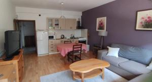 The apartment features a fully equipped kitchen with an oven, microwave, stovetop, refrigerator and complete kitchenware allowing guests to prepare meals conveniently. Inside you will find a sofa bed alongside seating area furnishings including a wardrobe closet and heating system for comfort.