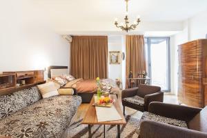 The apartment contains one bedroom with air conditioning and heating. Guests can prepare meals in the full kitchen outfitted with a stovetop, oven, dishwasher, refrigerator, dining table as well as tea and coffee making facilities. The living area includes a sofa bed and seating area while bathroom amenities feature complimentary toiletries such as shampoo and body soap alongside both bathtub and shower options. Additional room comforts include an ironing board with iron, clothes drying rack, towels, bed linen including synthetic non-feather pillows.