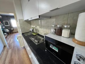 This air-conditioned apartment features one bedroom furnished with one bed, parquet flooring, and soundproof walls ensuring comfort and privacy. The accommodation includes a private bathroom equipped with complimentary toiletries, shampoo, a hairdryer as well as a bathtub or shower. Guests can enjoy an open-plan kitchen complete with an oven, stovetop, microwave, refrigerator, electric kettle and dining table. Additional in-room amenities comprise heating, sofa seating area with flat-screen TV including bedside sockets for easy charging, there is also an iron along with bed linen and towels provided.